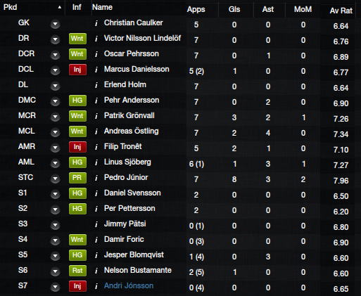 Überblick über die Leistungen meiner Spieler in der Superettan nach Spieltag 7.