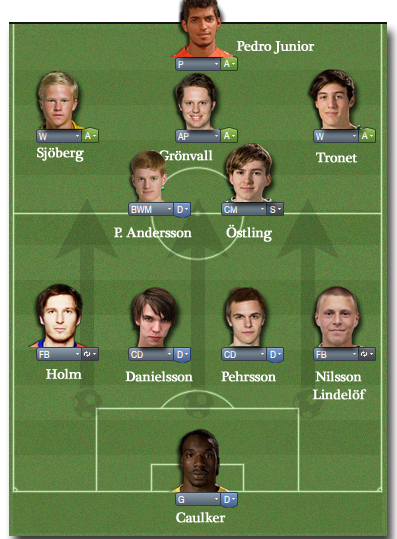 Caulker / Holm – Pehrsson – Danielsson – Pettersson / P. Andersson – Östling – Sjöberg – Grönvall – Tronet / Pedro Junior.