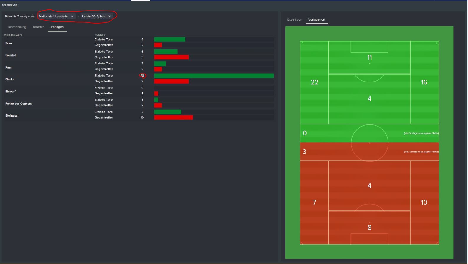 Zudem: Was diese Anzeige nicht aufzeigt, ist, wenn die Spielzüge mit Torfolge über die Flügel erfolgen, der Torwart die Kugel aber für einen Abstauber nach vorne boxt. Oder die häufigen Pfostentreffer, wenn Außenspieler den Ball von der Grundlinie zielen (nach einer Flanke, meine ich).