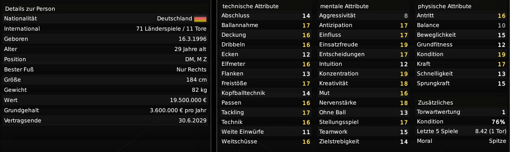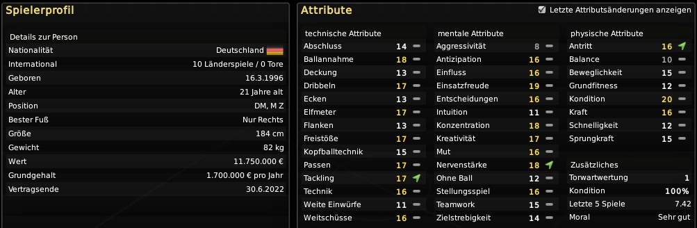Ja, das stimmt. Als Positionen hat er zwar nur ZM und DM, aber ich lasse ihn mit Freirolle und maximaler Kreativität spielen. Da turnt er auf dem Platz herum, wo es ihm gefällt und macht immer eine gute Figur, weil er ja alles gut kann.