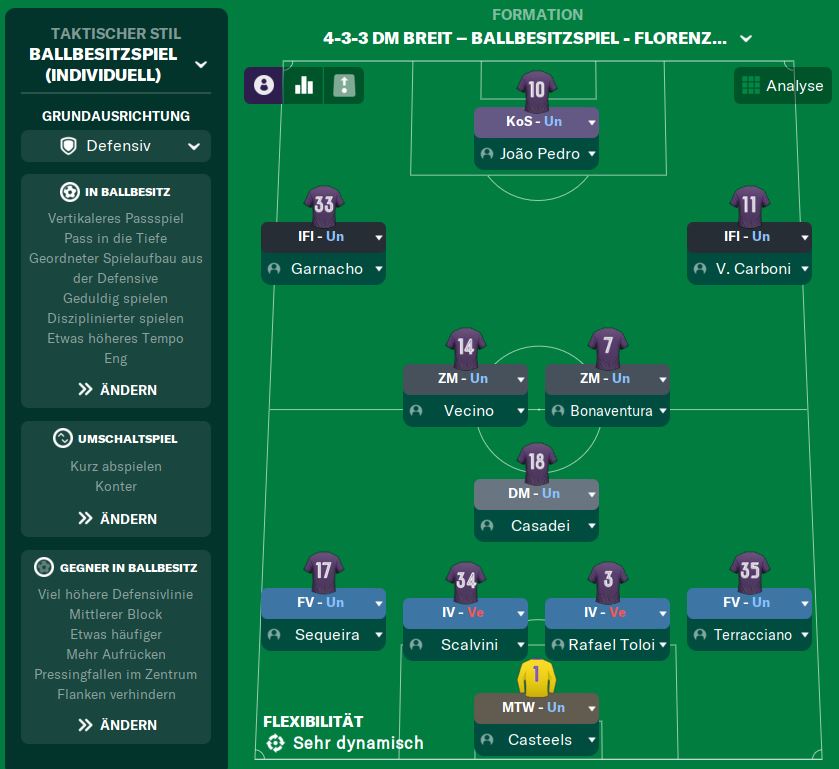 Das Spiel begann intensiv und bereits in der 18. Minute brachte Cesare Casadei, agierend als offensiver Mittelfeldspieler, Fiorentina mit einem präzisen Schuss ins untere Eck in Führung.
