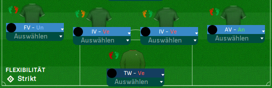 • Ich habe drei nominelle Innenverteidiger mit jeweils zwei Spielern für die linke und recht Abwehrseite. Daher tendiere ich dazu eine 4er-Kette zu spielen