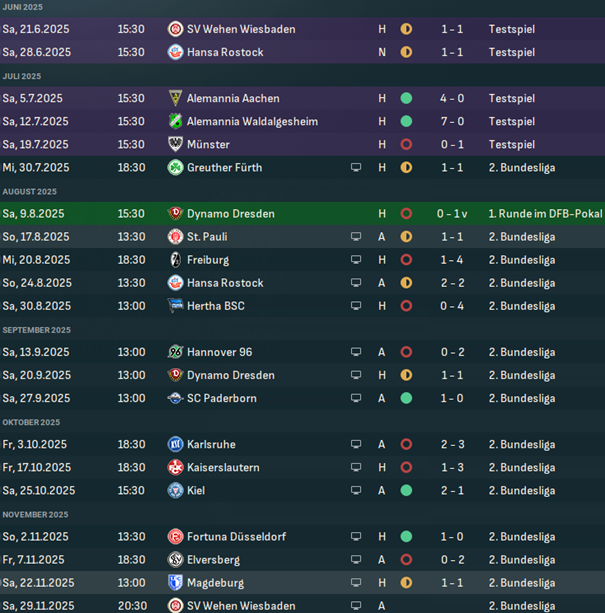 Ich bin aktuell im November 2025 beim 1. FC Saarbrücken angestellt. 2024 habe ich den Posten bei Saarbrücken kurz vor Saisonende angenommen und den Abstieg in die Regionalliga verhindert. Im darauffolgenden Jahr konnte ich die Meisterschaft gewinnen und in die zweite Bundesliga aufsteigen. Dabei habe ich eine Mischung aus Downloadtaktik, selbst entworfene Taktiken und einem Mischmasch verwendet. Ich wollte wieder von den Downloadtaktiken weg und habe meine eigenen entworfen. Nach einer guten Vorbereitung kam aber schnell die Ernüchterung. Die Medien tippen uns am Ende der Saison auf dem 18. Platz und wir kämpfen aktuell um jeden Punkt: