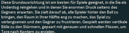 • Ich kann nicht erwarten, dass mein Mittelfeld großartige Passstafetten zaubert, daher lohnt sich ein Ballbesitzspiel kaum