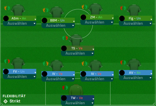 • Meine rechte Abwehrseite ist etwas stärker in puncto Flanken, daher soll der AV-A häufiger Flanken schlagen, der FV soll eine Balance aus Angriff und Abwehr sicherstellen