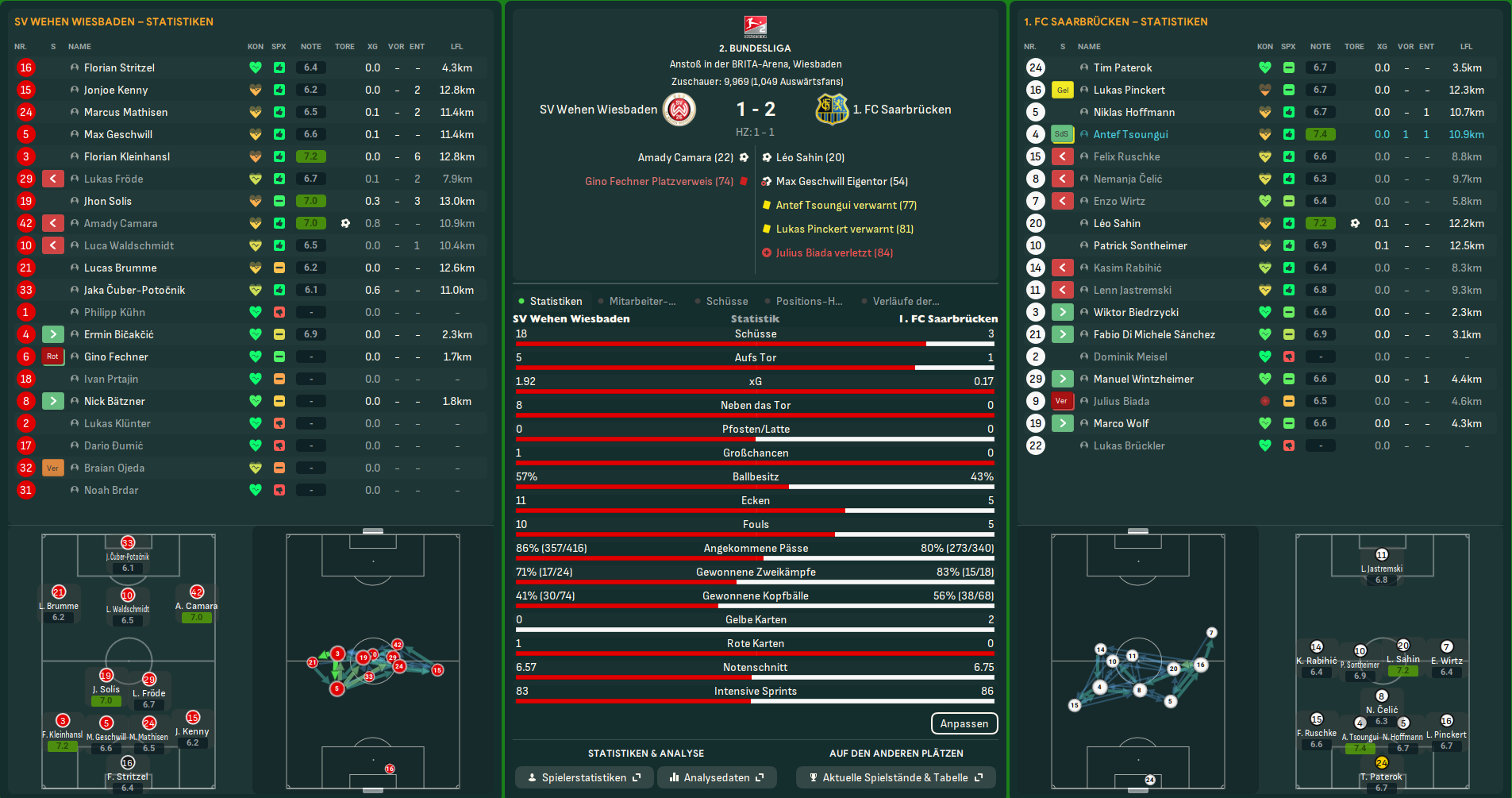 Das Spiel bleibt hart umkämpft, bis Wiesbaden in der 75. Minute eine rote Karte bekommt. Die zahlenmäßige Überlegenheit kann ich allerdings nur kurz ausnutzen, da sich einer unserer Spieler verletzt und rausgenommen werden muss nachdem ich meinen letzten Wechsel vollzogen hatte. In dieser Situation habe ich die TI Zeitspiel auf maximum gestellt. Außerdem habe ich unseren Stürmer auf die Position des ausgefallenen ASm gezogen um die defensive Stabilität zu behalten. In der 90. Minute habe ich dann beide Außenverteidiger auf AV-U und die Flügelspieler auf DFl-V gestellt um die Flanken zu sichern. Ich stellte fest, dass Wiesbaden in den letzten Minuten vermehrt frühe Flanken in den Strafraum beförderte.