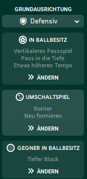 Wie zu Anfang geschrieben möchte ich auf Kontertore setzen, da meine Spieler nicht gut genug für ein Ballbesitzspiel sind. Daher habe ich als Grundausrichtung Defensiv gewählt: