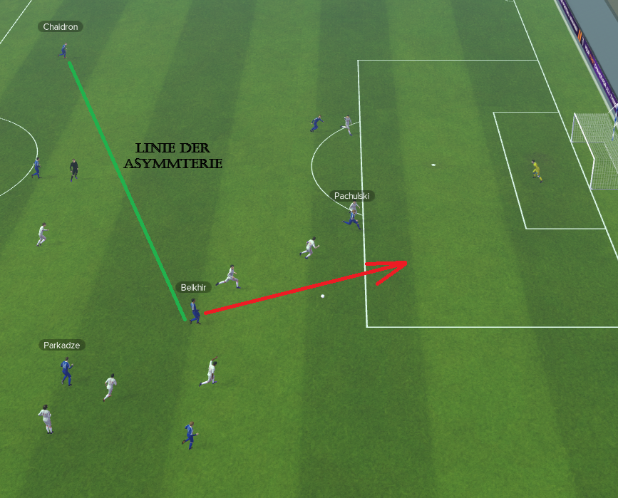Auf dem Feld kann man die Vorzüge der Asymmterie beim 3:0 durch Akbulut erkennen. Da Belkhir sich immer wieder gerne sehr weit vorne zeigt, haben Parkadze (ZM) und Herzog (off. Flügel) eine weitere Anspieloption. Hier bekommt der rechts Außenverteidiger einen Ball und gibt ihn schnell weiter an Pachulski (Stürmer), der in der Folge auf den Torschützen quer legt.