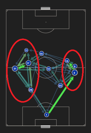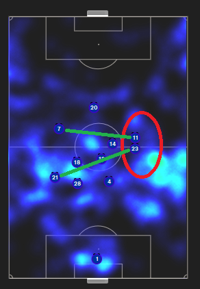 Die Passmappe belegt eine Beobachtung, die Noergelgnoms Hinweis eher widerlegt, denn es kommt eher auf der rechten Seite zu Ineffizienzen im Positionsspiel.