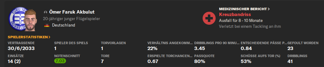 Schade nur, dass Ömer Akbulut sich im Spiel gegen Dynamo Dresden das Kreuzband gerissen hat und erst im Herbst 2030 wieder einsatzfähig sein wird.