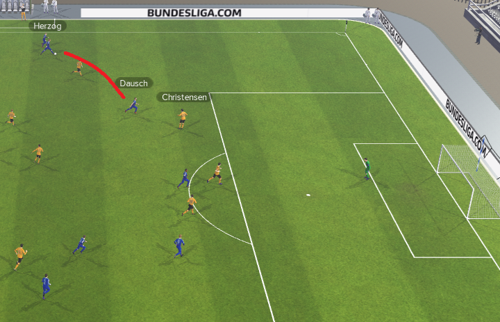Effizienter hingegen spielt die linke Seite um Dausch und Herzog. Hier findet der Außenstürmer den sich offensiv orientierenden Dausch, dem es in der Folge gelingt, den Dresdner Verteidiger Christensen mit einer Körpertäuschung zu narren und mit dem starken rechten Fuß ein Tor aus etwa 18 Metern zu erzielen.