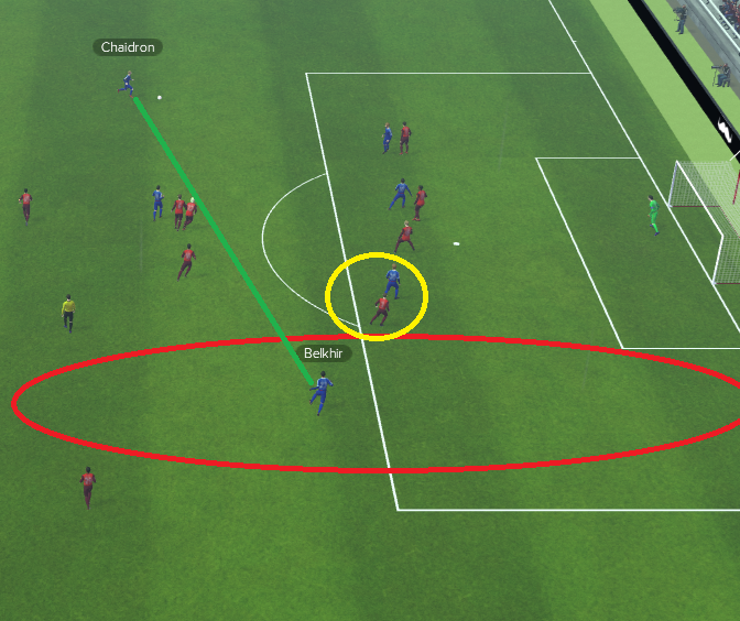 Eine zweite Szene, nun aus dem Lautern-Spiel, zeigt, dass die Kombination aus der offensiver Positionierung Belkhirs und der gemäßigtem Mitarbeit Chaidrons sogar das Zeug hat, dass beide Spieler sich in einer Szene ergänzen. Während Chaidron für eine Flanke freigespielt worden ist, besetzt Belkhir den Halbraum im Grunde alleine und sorgt dafür, dass der FCK-Außenspieler Bueno etwas zu spät (gelber Bereich) in die Defensivaktion kommt und es fast 4:0 stehen könnte.