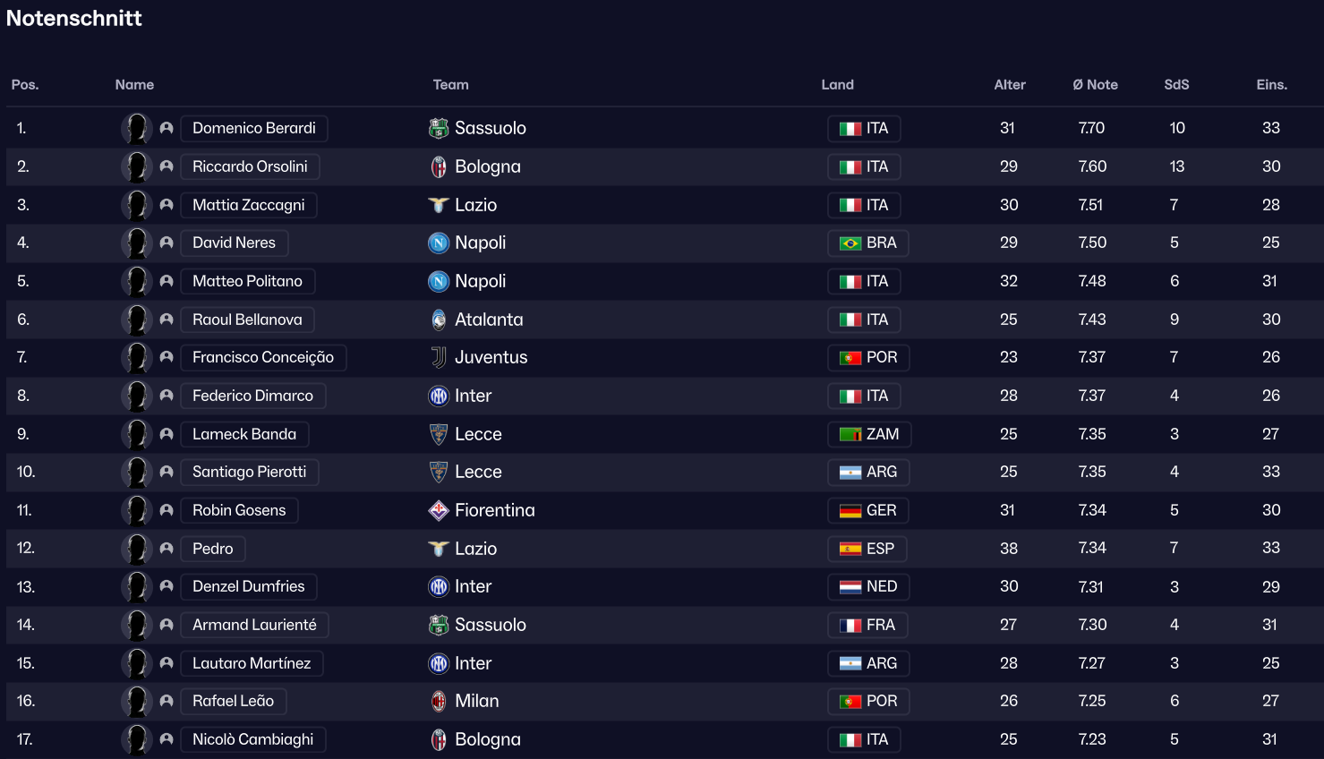 Wobei die Noten nicht so abhängig von den Scorern zu sein scheinen, was das wieder etwas abmildert. Leao hat 18 Scorer, Berardi 17 in weniger Spielen. Der Notendurchschnitt ist aber schon massiv zwischen den beiden.