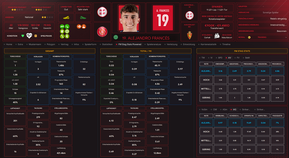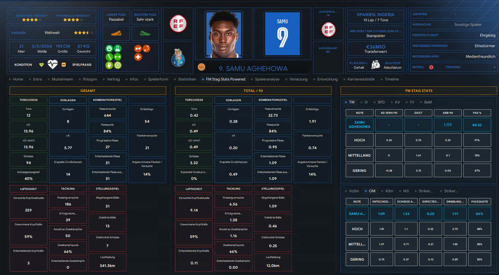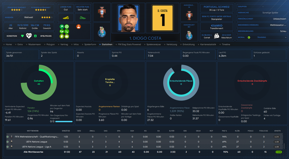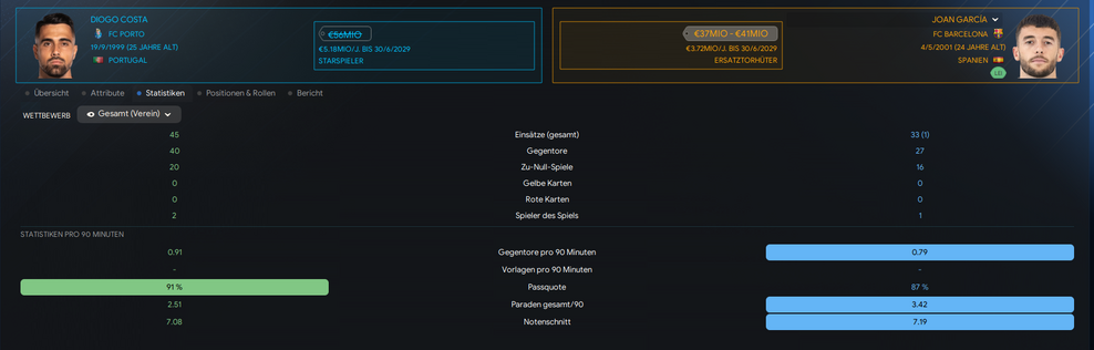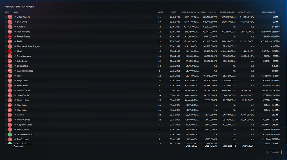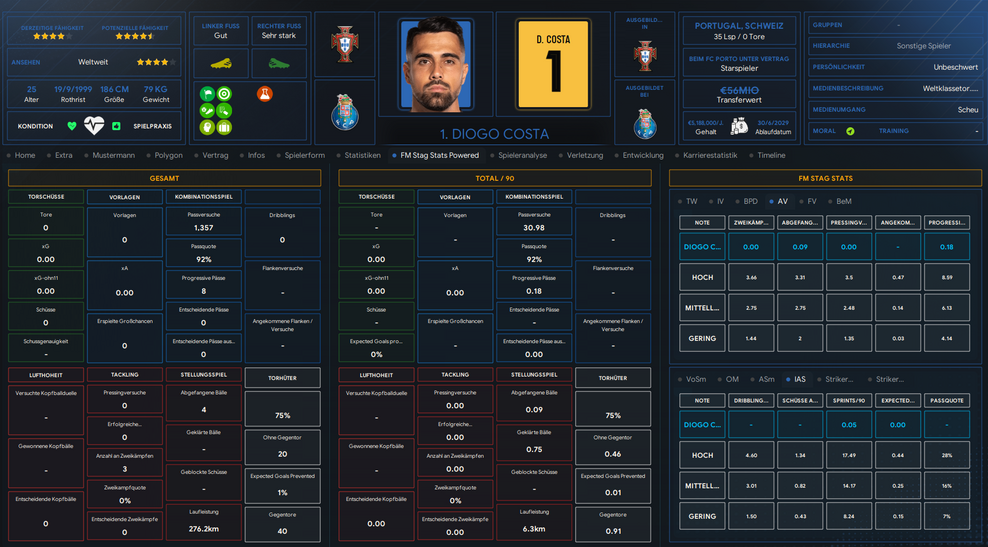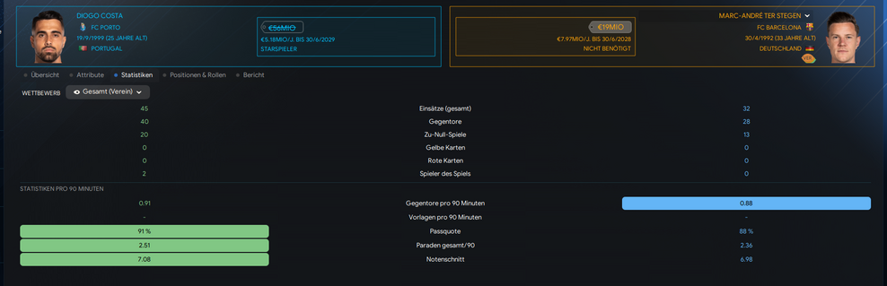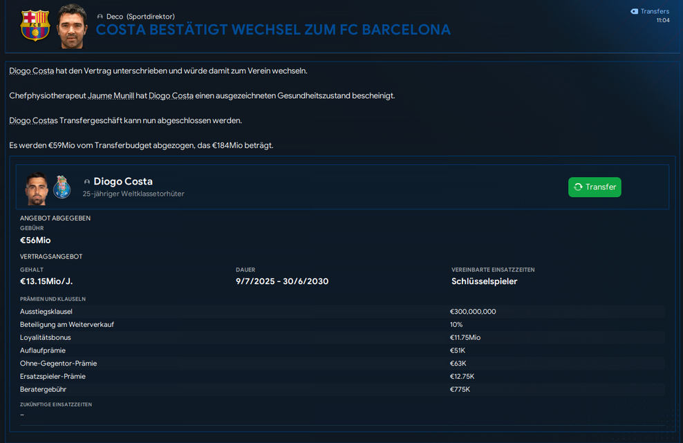 Kapitel 30 – Transfersommer 2025 Der Sommer 2025 steht ganz im Zeichen eines kontrollierten Umbruchs: verdiente Spieler verlassen den Verein, während gezielt Profilspieler und junge Bausteine für die nächste Generation geholt werden. Abgänge: Marc-André ter Stegen → Al-Fayha FC ![]() Ter Stegen verlässt den FC Barcelona nach vielen Jahren als Nummer eins und wechselt zu Al-Fayha FC. Sportlich war er in der vergangenen Saison bereits hinter Joan García nur noch die Nummer zwei, wirtschaftlich bringt der Transfer noch einmal eine ordentliche Ablösesumme in die Kasse. Taktisch öffnet der Abgang die Tür für einen klaren Schnitt auf der Torhüterposition: Der Ballbesitzfußball der Mannschaft wird künftig komplett über das neue Keeper-Duo García / Diogo Costa aufgezogen, ohne Rücksicht auf Hierarchien aus der Vergangenheit. Trainerkommentar: „Marc-André hat dieses Team über Jahre geprägt. Irgendwann kommt aber der Moment, an dem sich Wege trennen müssen – nicht aus mangelnder Qualität, sondern weil eine neue Generation Verantwortung übernimmt. Er geht mit großem Respekt und hinterlässt ein hohes Level an Professionalität, das die jungen Torhüter mitnehmen müssen.“ Ansu Fati → Aston Villa ![]() Ansu Fati wechselt für eine moderate Ablöse zu Aston Villa, inklusive Bonuszahlungen und Weiterverkaufsklausel. Sportlich war der Weg bei Barcelona zuletzt blockiert: Auf den Außenbahnen haben sich Lamine Yamal, Nico Williams und Ferran Torres festgespielt, dahinter drängen weitere junge Offensivspieler nach. Der Transfer ist daher eine Mischung aus Neustart für den Spieler und sinnvoller Kadersäuberung. Die Offensivrotation wird schlanker, die Minuten verteilen sich klarer auf die tragenden Flügelspieler. Trainerkommentar: „Ansu braucht vor allem eines: konstante Spielzeit und die Möglichkeit, Fehler zu machen, ohne dass sofort die ganze Fußballwelt hinschaut. Diese Bühne konnte der Klub ihm nicht mehr geben. Der Wechsel ist für ihn eine Chance, seine Karriere neu zu starten – und für die Mannschaft bedeutet er mehr Klarheit in der Hierarchie auf den Außen.“ Eric García → Benfica Lissabon ![]() Eric García schließt sich Benfica Lissabon an – ein Transfer, der sportlich wie wirtschaftlich Sinn ergibt. Mit Pau Cubarsí, Ronald Araújo, Dean Huijsen und nun auch Alejandro Francés ist die Innenverteidigung sehr gut und vor allem jung besetzt. García wäre perspektivisch nur noch Rotationsspieler gewesen. Die hohe Ablöse von rund 30 Mio. sorgt gleichzeitig für zusätzlichen Spielraum auf dem Markt und finanziert indirekt Teile der Verstärkungen im Defensivverbund. Trainerkommentar: „Eric ist ein spielstarker Innenverteidiger, aber der Konkurrenzkampf im Zentrum ist brutal. Für seine Entwicklung ist ein Klub wie Benfica, der viel Ballbesitz und internationale Bühne bietet, perfekt. Für die Mannschaft war es wichtig, den Kader zu verschlanken und den jungen Stammverteidigern klar das Vertrauen zu geben.“ Zugänge Diogo Costa → FC Porto ![]() ![]() ![]() ![]() ![]() Mit Diogo Costa kommt ein Torhüter im besten Alter, der sowohl statistisch als auch vom Profil her ideal zur Spielidee passt. Hohe Passquote, starke Paradenrate und ein sehr guter Notenschnitt zeigen, dass hier ein Keeper verpflichtet wird, der Spiele entscheiden kann. Im Vergleich zu Ter Stegen bringt Costa noch etwas mehr Strafraumpräsenz und Reichweite mit. Zusammen mit Joan García entsteht ein Torhüterduo, das nicht nur die Gegenwart absichert, sondern auch mittel- bis langfristig den Rückhalt für eine dominierende Mannschaft stellt. Trainerkommentar: „Diogo ist kein Experiment, sondern ein fertiger Spitzentorhüter. Er vereint Ruhe am Ball mit Explosivität auf der Linie – genau das, was eine Mannschaft braucht, die hoch steht und viel Risiko im Aufbau geht. Mit ihm und Joan ist die Position auf Jahre hinaus top besetzt.“ Alejandro Francés → Girona FC ![]() ![]() Alejandro Francés kommt als vielseitiger Innenverteidiger mit guter Athletik und ordentlichem Ballbesitzprofil. Die Daten zeigen einen aggressiven, zweikampfstarken Verteidiger mit hoher Kopfballaktivität und starkem Pressing-Output. Als Rotationsspieler bringt er Tiefe, ohne das Niveau spürbar zu senken. Er bleibt aber diese Saison noch bei Giorona. Seine Fähigkeit, sowohl in einer hochstehenden Viererkette als auch in einer Dreierkette zu agieren, macht ihn taktisch wertvoll – gerade in einer Saison mit vielen Wettbewerben. Trainerkommentar: „Francés ist genau der Typ Verteidiger, den ein Kader auf diesem Level braucht: jung, hungrig, flexibel einsetzbar. Er kann ohne Probleme zehn bis fünfzehn Startelfeinsätze gehen, ohne dass die Stabilität leidet. Und wenn er seine Entscheidungen in Ballnähe noch sauberer trifft, hat er Luft nach oben.“ Samu Aghehowa → FC Porto ![]() Samu Aghehowa war bereits im Winter verpflichtet worden und stößt nun endgültig zum Team. Der junge Stürmer bringt ein spannendes Profil mit: Hoher xG-Wert, viele Abschlüsse, gutes Bewegungsspiel im Strafraum und ordentliche Kombinationsansätze im Kurzpassspiel. Er ist weniger klassischer Wandspieler, sondern eher ein dynamischer Strafraumstürmer, der ständig in Tiefe und Zwischenräume startet. Damit ergänzt er die vorhandenen Optionen im Angriff ideal – insbesondere neben einem erfahreneren Stürmer oder als Rotationspartner. Trainerkommentar: „Samu ist ein Stürmer, der ständig Gefahr ausstrahlt. Er braucht nicht viele Ballkontakte, um im Spiel zu sein – seine Läufe und sein Gespür für Abschlusssituationen reichen. Wenn er vor dem Tor noch konstanter wird, kann er in den nächsten Jahren zu einer echten Waffe werden.“ |